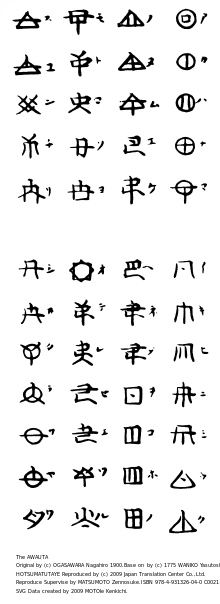 Reference to the "Hotsuma Tsutae"(Manuscripts to OGASAWARA Nagahiro (小笠原長弘, ogasawara nagahiro) March 3, 1900) Establishment kana to right of the character(WOSITE jindai moji)hotsuma.gr.jp awa-no-uta).