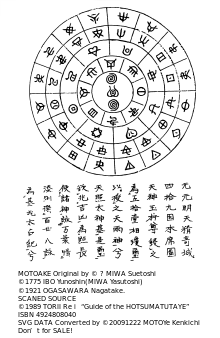 - 1 2 Yoshinosuke Matsumoto hotsuma tutahe - himerareta nihon kodaisi (ホツマツタヘ―秘められた日本古代史) The Mainichi Newspapers Co., Ltd (1980/07) ISBN 4-620-30724-6 ISBN 978-4620307244 - Public appars.