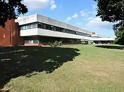 Once the London Borough of Hounslow had been formed in 1965,[4] the new civic leaders proceeded to procure a new building.[2] Construction work, which was carried out by M J Gleeson at a cost of £4.9 million, started in 1972.[5] The new building, which was designed by the borough architect, George Trevett, was officially opened on 17 November 1975.[5] The design involved four low-rise glass and concrete pavilions connected by a central spine containing the main staircase and was set in extensive landscaping designed by Jakobsen Landscape Architects.[5] Three of the pavilions contained open plan space for council officers and their departments while the south-eastern pavilion, sometimes referred to as the "civic pavilion", contained at its centre a twelve-sided council chamber which appeared at roof level as a drum.[5] The main frontage of the civic pavilion, like the other pavilions, featured a series of glass entrance doors on the ground floor; there were layers of continuous stone facing panels above and below a continuous band of glazing on the first floor.[5]