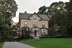 The House at 42 Hopkins Street in Wakefield, Massachusetts is an excellent early example of an Italianate house. Built c. 1850, the 2+12-story wood-frame structure is an early example of balloon framing (replacing the earlier mortise and tenon style). It is three bays wide, with wide eaves and double brackets, corner pilasters, and a high granite foundation. Its front entry is sheltered by Colonial Revival portico added around the turn of the 20th century.[2]