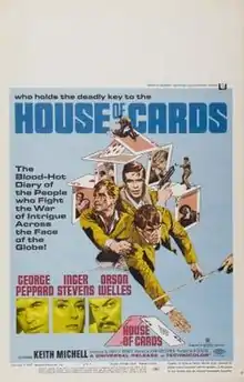 House of Cards is a 1968 American neo-noir crime film directed by John Guillermin and starring George Peppard, Inger Stevens, and Orson Welles. Filmed in France and Italy, it marked the third time that Peppard and Guillermin worked together (they had previously collaborated on the 1966 film The Blue Max, then P.J.).[1]