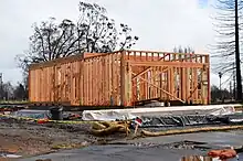 Wood framing is widely used in home construction in the United States, accounting for 90% of new houses in 2019.[11] Concrete is used to build a foundation, usually with either a crawl space, or basement included. Interiors usually have drywall. Roofing often consists of asphalt shingles, although steel, and tile materials are also used.[12]