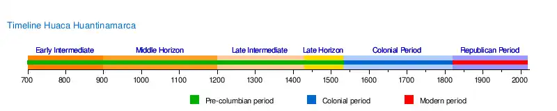 The architectural evidence shows that the last phase of occupation of Huantinamarca corresponds to the Late Horizon period (1476 AD to 1532 AD), a time when the Incas occupied the central coast.[3]
