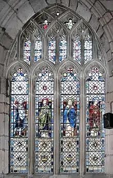 - Church of the Holy Cross in Crediton, Devon – In 1913 Arnold designed windows that reflected the church's history. The parish church dates mainly to the 15th century but has some 12th and 13th century remnants. In a roundel, Arnold depicts the Saxon Cathedral which Eadulph had begun to build on the site of the present church. Below is another roundel where the Charter granted by King Edward the Elder is depicted. The coats of arms of the donors, Mr. and Miss Ingram Walker, are included in the design. Hugh Arnold was their brother-in-law. The window's inscription records that the window is in memory of Ingram Bathurst Walker and Bessie, his wife, the daughter of William Pope, and Wiliam Bathhurst Walker, their son.[5]
