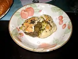 Hújiāo bǐng or pepper bun (Chinese: 胡椒餅; pinyin: hújiāo bǐng; Pe̍h-ōe-jī: hô͘-chio-piáⁿ; lit. 'black pepper cake or biscuit') is a type of baked bun that originated in city of Fuzhou, the capital of China's Fujian province. It is a street food that has become popular in Taiwan and can be found in night markets or mini food stalls throughout Taiwan. The common ingredients are flour, water, and a leavening agent for the outer dough shell, and a meat protein (usually pork or beef) marinated with sugar, soy sauce, white pepper or black pepper, and scallion for the inside filling.[1]