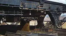 Along these girders ran a carriage which could move toward or away from the dock face. This in turn carried a large walking beam which could be raised or lowered; at the dock end of this was a vertical column with a large scoop bucket on the end. A parallel beam was mounted halfway down this column to keep the column vertical as it was raised or lowered. The machine's operator, stationed in the vertical beam above the bucket for maximum cargo visibility, could spin the beam at any angle. The scoop bucket was lowered into the ship's hold, closed to capture a quantity (10 tons approx.) of ore, raised, and moved back toward the dock. The workmen who operated the Hulett uploaders were known as Ore Hogs.[3]