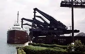 The Hulett was invented by George Hulett of Conneaut, Ohio, in the late 19th century; he received a patent for his invention in 1898. The first working machine was built the following year at Conneaut Harbor.[1] It was steam powered, successful, and many more were built along the Great Lakes, especially the southern shore of Lake Erie to unload boats full of taconite from the iron mines near Lake Superior. John W. Ahlberg converted the Huletts in Conneaut to electricity in the 1920's. Substantial improvements were later made on the design by Samuel T. Wellman.