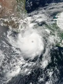 With continued favorable conditions, Carlotta quickly developed a ragged central dense overcast, or centralized area of convection.[7] An eye feature began developing on June 15,[8] and later that day Carlotta intensified into a hurricane while approaching southwestern Mexico.[9] A Hurricane Hunters flight late on June 15 indicated Carlotta was rapidly intensifying, observing winds of 110 mph (180 km/h) in the eye and well-established outflow; the crew also observed flight-level winds of 114 mph (183 km/h). The NHC initially predicted the hurricane would move along the Mexican coast just offshore, which would have allowed Carlotta to maintain much of its intensity.[10] Shortly after its peak, Hurricane Carlotta weakened slightly as to the eye's began to interact with land.[11] The hurricane made landfall near Puerto Escondido, Oaxaca, with winds estimated at 105 mph (169 km/h) and a minimum pressure of 976 mbar (28.8 inHg), shortly after 0100 UTC on June 16,[12] becoming the easternmost tropical cyclone in the Eastern Pacific to make landfall at hurricane intensity on record until surpassed by Hurricane Barbara a year later.[1][13] Carlotta rapidly weakened while moving inland, and it had deteriorated to tropical depression status by 12 hours after landfall. Although the cloud pattern became disrupted, the storm maintained a large area of thunderstorms.[14] Very early on June 17, the NHC reported that Carlotta had weakened into a post-tropical remnant low; the system still had a broad circulation over southwestern Mexico at the time.[15] Later that day, the low degenerated into a trough along the west coast of Mexico.[16]