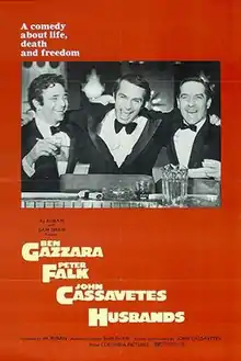 Husbands is a 1970 American comedy-drama film written and directed by John Cassavetes.[2] It stars Ben Gazzara, Peter Falk, and Cassavetes as three middle class men in the throes of a midlife crisis following the death of a close friend.[3]