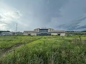 The station has two side platforms and two through tracks,[2] and a siding for freight.[3][4] There is a station building containing an enclosed waiting area to the south of the line.