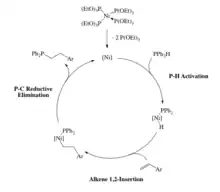 The usual mechanism for hydrophosphination for late metal catalysts involves insertion of the alkene into the metal-phosphorus bond. Insertion into the metal-hydrogen bond is also possible. The product phosphine is produced through reductive elimination of a P-C bond rather than a P-H bond in Glueck's system.[13][14] The Ni(0) catalyst involves oxidation addition of a P-H bond to the metal, followed by insertion of the alkene into the M-H bond.