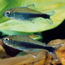Hyphessobrycon clavatus is a species of South American tetra, belonging to the family Characidae. It is a pale golden green color, with its belly being even paler. It has an orange midlateral line. Below the midlateral line is a thick black stripe that fades around the gills. Their fins have white tips. They are known to reach about 3 centimeters (1.2 inches) in length. Its species name, clavatus, is derived from the Latin term clava lat, meaning club-shaped. Hyphessobrycon clavatus is known to inhabit the waters of Peru. As a pelagic fish, they swim near the surface of the water. They have seen limited use in the fish trade.