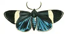 Upperside: antennae black and pectinated (comb like). Tongue orange and spiral. Head, thorax, and abdomen fine mazarine blue. Anterior wings dark mazarine, having a single white bar running from the middle of the anterior edge to the lower corner. A small part of the cilia at the tips is white, the rest being of the same colour as the wings. Posterior wings of the same colour as the superior, and immaculate, except the cilia, which is entirely white.