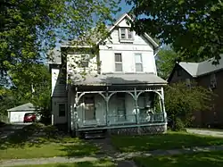 The house is a simplified version of the Queen Anne style known as the Shingle Style. This structure is also an example of a "pinwheel" house.[3] It is a two-story square box, with a pointed hipped roof, and gabled projections that are asymmetrically placed at the front and on the sides of the structure.[3] The house also features an Eastlake porch, a variety of surface textures and stained glass transom lights.