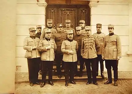 In the years following his expeditions, Zadik acquired an international reputation, which reached the Republic of Armenia. In a report he compiled for the latter's government in 1919, Bessarabian Armenian activist Artyom Tumanyan noted that Zadik was one of Romania's most prominent "indigenous Armenians"—though he also indicated that such Armenians had fully assimilated into Romanian life.[79] Again withdrawn from active duty, Zadik served on the Superior Council of the Romanian Army (1922–1924) and a review board for would-be generals. In April–November 1924, he was Military Commander of Bessarabia.[13] In 1923, the year when he welcomed to Romania Ferdinand Foch,[80] Zadik was made a Commander of the Legion of Honor, a Grand Officer of the Order of Saints Maurice and Lazarus, and a Grand Officer of the Star of Romania.[25] In 1925, he attended a commemoration of the Council of Nicaea, and appears in the collective portrait done by Gheorghe Popovici.[81] By 1928, he was also a vice president of Cultul Eroilor ("Heroes' Cult") society, in which capacity he obtained that a World War memorial be erected at Galata.[82]