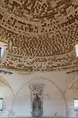 The mosque's dome is 11 metres in diameter, and rests on eight arches.[3][1] Today, the spherical triangles formed in the corners from the arches on its four walls can still be seen, and so does the arch above the entrance.[2] Furthermore, the mihrab with its elaborate relief designs and the base of the demolished minaret inside the building are also still visible.[2] The minaret, which once stood on the northwestern corner of the church/mosque,[3] collapsed at the beginning of the twentieth century, and was never rebuilt.
