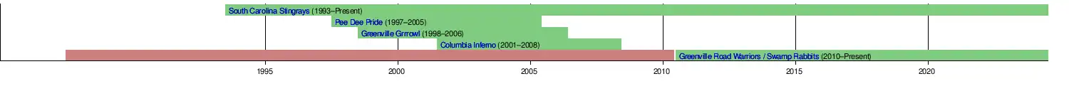 In the succeeding years, the Stingrays win three Kelly Cups and have been one of the ECHL's most success full teams. As the flagship franchise for the state, the Stingrays have inspired several other attempts at professional hockey in the state but few have succeeded. The Pee Dee Pride (1997), Greenville Grrrowl (1998) and Columbia Inferno (2001) all attempted to expand the reach of ice hockey in the state but none were able to reach their 10-year anniversary. Greenville received its second franchise when the Johnstown Chiefs relocated in 2010 and became the Road Warriors.[5] Though the team underwent a second name change to become the 'Swamp Rabbits', the franchise established itself and signed an affiliation deam with the Los Angeles Kings in 2022.[6]
