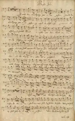 The central aria, in a major key, begins with an exalted acceptance of hardship and punishment, "I kiss the whip with joyful courage". It claims that the "myrrhs of the pains are sugar to the heart".[7] The second recitative expresses the hope that the "cross is my ladder to heaven".[7] The concluding aria turns to longing for death as a way to Heaven, "Ah, my Saviour, if only I would [be lifted to Heaven] tomorrow". The singer expects "yes" ("Ja") to the question if the hour of departure will be soon. For this final line, the music is lively, and the hoped-for "yes" is repeated several times, the last time after a rest, and in low register.[7]