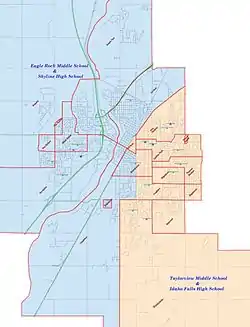 The Idaho Falls School District #91 is a public school district in the U.S. state of Idaho. District #91 serves about 10,742 students of Idaho Falls, Idaho, and parts of rural Bonneville County in 18 schools, making it the seventh-largest by enrollment in the state. The district has: 12 elementary schools serving students in K-6, two middle schools serving students in grades 7-8, and two high schools serving students in grades 9-12, along with an alternative high school and Compass Academy, a magnet high school through the New Tech Network.[3]