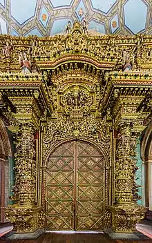 The interior main gate, the work of Bernardo de Legarda, is considered one of the richest manifestations of Quitoan Baroque, which Pazos Barrera describes as "a fabulous wood carving from the beginning of the 18th century. In it, the columns have given way to plant forms that culminate in capricious capitals and cornices. It reproduces, on the interior side, the symbols of the main altar". The central vault, whose dome was decorated with frescoes that reproduce scenes from the Bible, was also commissioned to master Legarda in 1742, who assigned the painter Francisco Albán for that work.