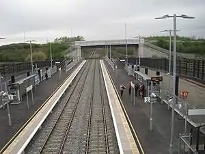 During February 2015, the finding of more great crested newts at the site was attributed as having caused further delays for the start of construction; as a result, the station's intended opening date was expected to be achieved by August 2016,[9] but one year later, this had become "late autumn".[10] Further delays led to the opening date being pushed back into the first quarter of 2017.[11] During January 2017, the scheduled opening date of Sunday, 2 April 2017 was finally announced.[2]