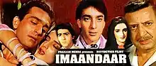 Imaandaar (Hindi: ईमानदार) is a 1987 Indian Bollywood action crime drama film directed by Sushil Malik and produced by Surendra Pal Choudhary and Mrs. Sarla Sandhu. The film stars Sanjay Dutt, Farah in lead roles, along with Rohan Kapoor, Ranjeet, Mehmood, Pran, Om Prakash in supporting roles.