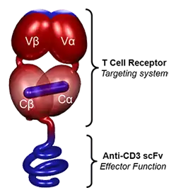 ImmTACs are fusion proteins that combine an engineered T Cell Receptor (TCR) based targeting system with a single chain antibody fragment (scFv) effector function. TCRs, like antibodies, constitute an important antigen recognition system within the immune system; but, whereas antibodies are restricted to targeting cell surface or secreted proteins TCRs can recognise peptides derived from intracellular targets presented by human leukocyte antigen (HLA). Naturally occurring TCRs are low affinity (0.18-387 micromolar range[1]) 2-chain membrane receptors expressed on the surface of T cells. To produce stable, soluble, high affinity TCRs capable of being used as diagnostics and therapeutics the two TCR protein chains are stabilised through the introduction of a novel disulphide bond between the 2 constant domains[2] and the affinity increased 1-5 million fold to low picomolar values through phage display affinity maturation.[3] To provide the soluble, affinity enhanced TCR with a biological effector function the beta chain of the TCR is fused to an scFv antibody fragment specific for the CD3 T cell co-receptor, creating an ImmTAC. The molecular weight of an ImmTAC molecule is ~75kDa.