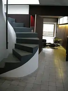 The apartment that Le Corbusier built for his personal use on the top two floors extends over 240 m2 (2,600 sq ft). It is reached by stairs from the sixth floor, the last level served by the elevator. Rooms are arranged to eliminate corridors and minimize the number of doors.[9] The seventh floor contains the entrance, living room, kitchen, and atelier. The eighth floor contains a guest room and access to the roof garden.[10] Walls are painted in pure primary colors. The atelier that Le Corbusier used for his painting has a wall of stone and exposed rough brick that contrasts with the modern concrete and glass materials.[8] Furnishings were designed by Le Corbusier's associate Charlotte Perriand.[11]