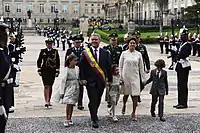 After his speech, Duque and his family prepared to take the road to the Nariño house where former President Juan Manuel Santos, his wife María Clemecia and their youngest son Martín were waiting for the new presidential family, upon arrival Duque received his first greeting from the armed forces as the new Head of State, and immediately afterwards the two families proceeded to greet each other, to give rise to the next act where Juan Manuel Santos, after eight years as President of Colombia, together with his family, descendants of the central staircase of the house of nariño to take the traditional last walk through the house of nariño as head of state.[5]