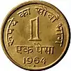 The Indian One Paisa coin (Hindi: पैसा) is a former denomination of the Indian Rupee. The 1 coin equals 1100 (one-hundredth) of the Indian Rupee. The symbol for paisa is (). In 1955, India adopted metric system for coinage and amended the "Indian Coinage Act". Subsequently, one paisa coins were introduced on 1 April 1957. From 1957 to 1964, one paisa coin was called "Naya Paisa" (Hindi: नया पैसा) (English: New Paisa) and on 1 June 1964, the term "Naya" was dropped and the denomination was simply called "One paisa". One paisa coin has been demonetized and is no longer legal tender.