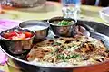| Dosa | ![]() | A fermented crepe or pancake made from rice batter and black lentils,[12] it is indigenous to and is a staple dish in the South Indian states of Andhra Pradesh, Karnataka, Kerala, and Tamil Nadu, as well as being popular in Sri Lanka. Dosa is also popular in Singapore,[13] where the name thosai is more common,[14] and in Myanmar as toshay. |