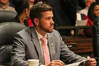The proposal was supported by all major Democrats at the city and state level. Aside from the mayor and Democratic city councilors, the proposal was supported by Marion County Prosecutor Ryan Mears, Indianapolis Metropolitan Police Department Chief Randall Taylor, Marion County Sheriff Kerry Forrestal, and Corporation Counsel Matt Giffin.[23] Giffin, the city/county lawyer who would be responsible for invoking the law if it becomes enforceable, defended its constitutionality by describing it as a trigger law to go into effect if the state legislature or the courts allowed it.[23] At each hearing, a large contingent of Moms Demand Action Indianapolis activists in red shirts sat in the gallery and spoke in support of the proposal.[27]
