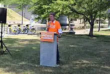 Shreve's plan was seen as a break from his past gun rights advocacy, and an attempt to appeal to the majority-Democratic Indianapolis electorate, with political reporter James Briggs called Shreve's embrace of gun control "remarkable for a Republican".[34][37] Hogsett's campaign called the announcement a "flip-flop". Shreve's proposals were met with some backlash from conservatives, with Freeman calling his position a "mistake" while still endorsing him, and local rightwing talk radio station WIBC's hosts predicting it could cost him the election.[30][35][34] The NRA released a statement harshly criticizing the ordinance and Shreve's plan, advocating for more prosecution of the violent crimes themselves without placing additional restrictions on gun ownership.[37] In response to the backlash, Greg Ballard—Indianapolis's last Republican mayor—and Paul Helmke—a former Republican mayor of Fort Wayne, Indiana and 1998 US Senate nominee—both came out in support of Shreve.[37]