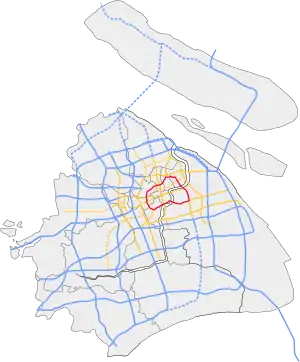 Inner Ring Road (simplified Chinese: 上海内环线; traditional Chinese: 上海內環線; pinyin: Shànghǎi Nèihuánxiàn; lit. 'Shanghai Inner Ring Line'), also known as Inner Ring Elevated Road (内环高架路; 內環高架路; Nèihuán Gāojiàlù), is an elevated expressway loop in the city of Shanghai. It was the first ring road around the city of Shanghai. The Puxi section of the road was completely grade-separated and complete in 1994, while the Pudong section of the road was completely grade-separated in 2009.[2] Before the grade separation in Pudong, the road ran at street level, with traffic lights at intersections.