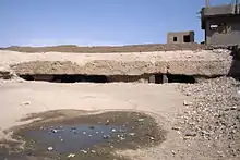 Intef's funerary complex was dug in a hill side at El-Tarif on the opposite bank of the Nile at Thebes and is known today as Saff el-Dawaba. The site of El-Tarif comprises three monumental royal tombs, known as saff tombs. Inscriptions found in one tomb indicate that it belonged to Wahankh Intef II, Intef I's successor. At the opposite, the Saff el-Dawaba is devoid of inscriptions but yielded the earliest type of pottery found at El-Tarif and, for this reason, is most often assigned to Intef I.[2][11] The Saff el-Dawaba comprises a large 300 by 75 metres (984 ft × 246 ft) sunken courtyard backed by a colonnade leading to a mortuary chapel carved into the hill and flanked by two chambers. The burial chamber of Intef I was dug beneath the mortuary chapel.[4]