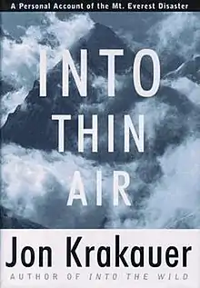 Into Thin Air: A Personal Account of the Mt. Everest Disaster is a 1997 bestselling nonfiction book written by Jon Krakauer.[1] It details Krakauer's experience in the 1996 Mount Everest disaster, in which eight climbers were killed and several others were stranded by a storm. Krakauer's expedition was led by guide Rob Hall. Other groups were trying to summit on the same day, including one led by Scott Fischer, whose guiding agency, Mountain Madness, was perceived as a competitor to Hall's agency, Adventure Consultants.[2][3]