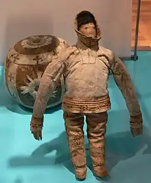 Inuit dolls are made out of soapstone and bone, materials common to the people of northern Alaska, Greenland and northern Canada. Many are clothed with animal fur or skin. Their clothing articulates the traditional style of dress necessary to survive cold winters, wind, and snow. Dolls could have been gifts to young Inuit girls, to be used as teaching devices and passing down of culture.[1] With these dolls, young girls learn various skills necessary for their survival such as skin preparation, cutting & sewing, proper use of materials, designs and significance of symbols in their cultures. Inuit dolls were enjoyed by both young and old Inuit individuals and give an excellent insight into Inuit culture.[1][2]