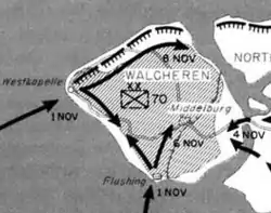 - ↑ The following is a quote from a report on the situation from a Civil-Affairs officer: "The semi-inundated villages of the island also were crowded with refugees, even the upper stories of houses whose ground floors were covered with two feet of water being used to the extent that whole families of up to twelve people were living in one room… Public utilities with one exception were not functioning: there was no rain water (rain water only from house cisterns was available), practically all wells were salted: there was no electric light or power; there were however limited supplies of gas in certain urban areas up to 1 hr. per diem at low pressure; there were no telephone facilities; the railroad was out of commission; the FLUSHING-MIDDELBURG-VEERE canal was tidal, due to the destruction of all locks and badly blocked, whilst the only road into Walcheren island was so damaged as to be available only for essential military traffic".[20]
