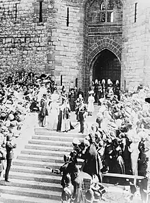 Members of the British royal family leave Caernarfon Castle following the investiture of the Prince of Wales, later Edward VIII, on 13 July 1911.
