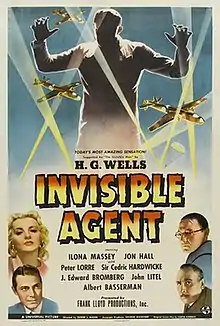 Invisible Agent is a 1942 American action and spy film directed by Edwin L. Marin with a screenplay written by Curt Siodmak.[3][4] The invisible agent is played by Jon Hall, with Peter Lorre and Sir Cedric Hardwicke as members of the Axis, and Ilona Massey and Albert Basserman as Allied spies.