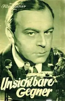 Invisible Opponent (German: Unsichtbare Gegner) is a 1933 German-Austrian drama film directed by Rudolph Cartier and starring Gerda Maurus, Paul Hartmann, and Oskar Homolka. The film's sets were designed by the art director Erwin Scharf. The plot revolves around an oil swindle in a South American country.[2] The film was made at the Sievering Studios in Vienna. The critics were not generally impressed with the film, the Deutsche Allgemeine Zeitung described it as "unbelievable and unbelievably awful picture".[3]