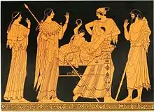 Iphicles was the son of Alcmene and her human husband Amphitryon, whereas Heracles was her son by Zeus. He also had a sister, Laonome, who married Euphemus or Polyphemus. Iphicles was the father of Heracles' charioteer Iolaus by his first wife, Automedusa, daughter of Alcathous.[2] Afterwards, he fathered two children by Pyrrha, the younger daughter of Creon.[3][4]