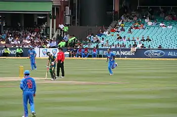 He also continued his prolific wicket-taking in the ODIs, taking eight wickets at 17.87 at an economy rate of 4.76 in three matches, including three top-order wickets in the deciding fifth ODI in Lahore.[27][31] He also scored 36 runs at 36.00 in the ODIs.[17] His ability to swing the ball both ways and his innings in Lahore led to speculation that he could become an all rounder.[32] In recognition of his performances at the start of his international career, Pathan was named the ICC Emerging Player of the Year in 2004.[33]