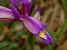 It has 2 pairs of petals, 3 large sepals (outer petals), known as the 'falls' and 3 inner, smaller petals (or tepals, known as the 'standards'.[18] The falls have a long haft or claw, (section closest to the stem) and a small rounded or oval blade.[16] They are 3–5 cm (1–2 in) long.[23] The centre of the blade has a pale yellow[5][13] or white central area,[24] which is veined with violet,[11][18] purple,[21] or blue.[25][11] Some references describe a dark purple area with white veining.[26] The claw is sometimes winged and tinged with green or brown,[27] or veined deep reddish-purple. The erect standards are purple blue,[28] purple,[11] or red-violet. They are 2–5 cm (1–2 in) long, with green or brown shade at the base.[23] It has a long and arching purple style branch[16][27] (that is long as the haft), and has a dark purple centre stripe.[28] They have a brown base.[12]