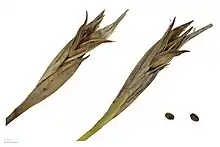 It has an ovary with double ridges, a 2-pointed stigma and pollen that is orange-red.[3] It also has a short perianth tube.[22] After the iris has flowered, it produces a 3–4 cm (1–2 in) long seed capsule,[26] which has a narrowed point.[7] Inside the capsule are pear-shaped seeds,[22][7] which are slightly compressed and flattened.[7]