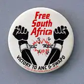 Responding to the mushrooming anti-Apartheid movement in South Africa and derived from a 1984-85 New Years greeting card he created, Fierstein designed and illustrated a button, banner, placard, and T-shirt depicted two fists breaking a chain with the slogan “Free South Africa”. This design was not only used in anti-apartheid marches in the United States, but the image came to be used the world over and to symbolize the struggle in South Africa. The button appeared on the collar of white South African anti-apartheid writer, journalist, and filmmaker Rian Malan when he was featured on Esquire magazine's cover in November 1985.[24] Actor Laurence Fishburne wore the T-shirt with the image in Spike Lee's 1988 movie “School Daze”,[25] and a clip of the banner painted by Fierstein which was carried in an August 1985 New York anti-Apartheid march and elsewhere was shown in the 2012 Documentary “Sing Your Song” celebrating the life of singer, actor, and activist Harry Belafonte,[26] as well as in other national and international media.[27][28][29]