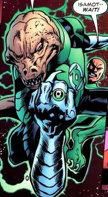 On his unfortune, Citadel forces, alleged allies of Rann, attack Thanagar just as Isamot's mate enters her only receptive mating period.[3] Isamot then must choose between his partner and the only possibility of a family. He chose his partner but by the time he returned she had taken another mate. With the mating urges over he returns to full duty. He later visits Mogo on Vath's advice for Mogo to council him on the pain for his recent loss, but rejects the therapy after noticing something is amiss when Green Man is behaving strangely.[4] When he, Vath, and Bzzd were sent after Guy Gardner, who was accused of murdering two fellow Green Lanterns, and confronted him on Mogo, Isamot was the first to believe Guy's story of something bizarre happening on Mogo due to his earlier suspicions. After arriving later, Soranik Natu, a medical expert, confirms that Mogo is infected with a disease created by the mushroom spores laid across its surface, and Isamot assists his fellow Lanterns in curing Mogo, while fighting off Kilowog, due to Kilowog also having been infected.[5]