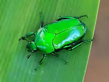 Ischiopsopha wallacei can reach a length of about 30 mm. The beetles are an electric green colour, and have the tip of the scutellum visible.
