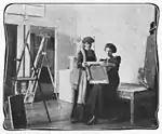Ise Morssing worked within several different fields in the visual arts including sculpture, landscapes paintings in watercolour and oil paint. She sculptured portraits and created with decorative reliefs for several buildings, some designed by her husband Gunnar Morssing.[2] Amongst her work is the 1912 entré to Karlavägen 11 with several wooden sculptures and a decorative magpie for the upper floor of the building.[3]