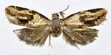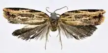 The wingspan is about 17.5 mm for males and 22 mm for females. The head, antenna and labial palpus are grayish brown, mixed with brownish-black scales. The thorax and tegula are brownish black, with sparse grayish-brown scales. The forewings are dark yellowish brown, tinged with ochreous scales in the distal half. The hindwings and cilia are grayish brown. The legs are dark yellowish brown, mottled brownish black on the ventral side of the foreleg and on the outer side of the mid- and hindlegs. The abdomen is dark grayish brown.